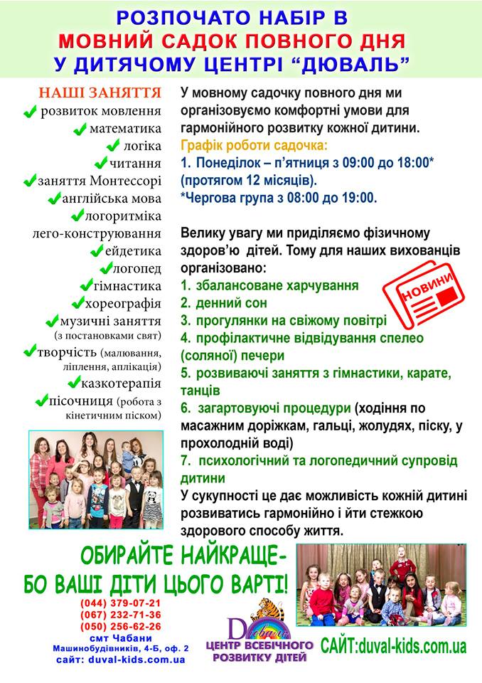 ____________________________________________________________________________________________________________ Супер новина! 1 жовтня відбулось відкриття другого садочку ДЮВАЛЬ КІДС!
