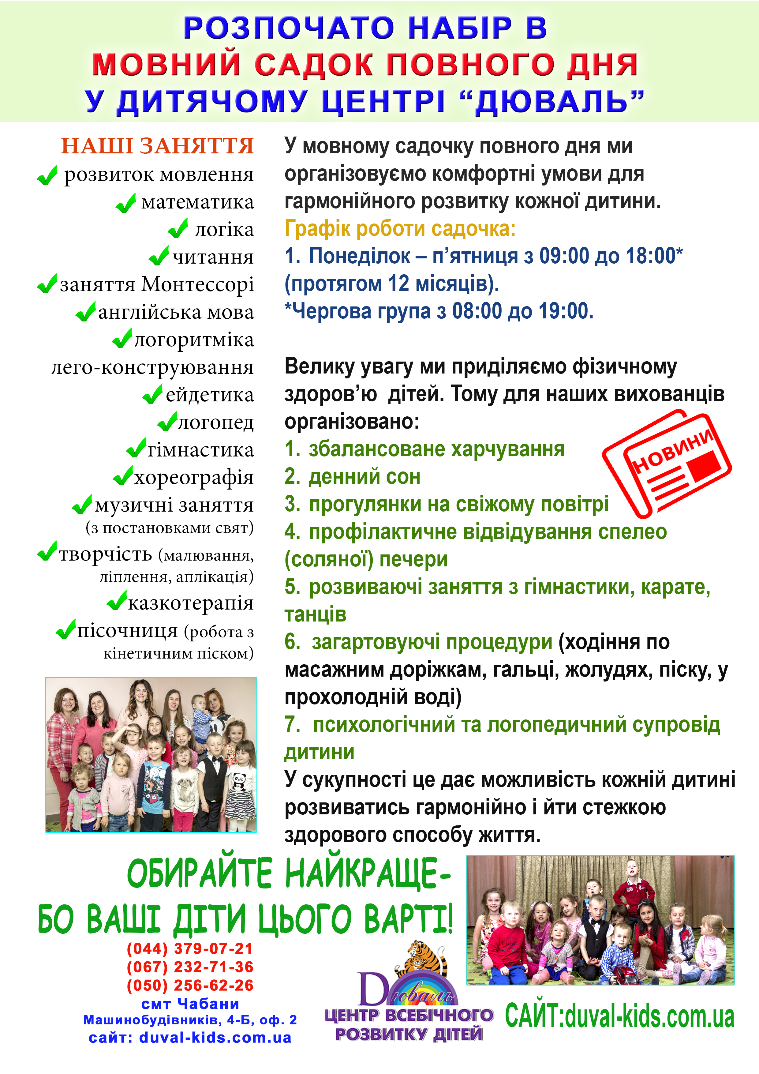 (044) 379-07-21 (067) 232-71-36 (050) 256-62-26 смт Чабани вул. Машинобудівників, 4-Б, оф. 2 duval-kids@hotmail.com |